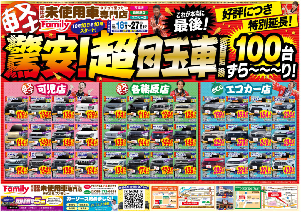 2025.7.4 イベント・キャンペーン, 車をお得に買う SUV, オプション, お値打ち, お得, スライドドア, セール, バン, ファミリーカー, 一宮市, 中古車, 即納, 可児市, 各務原市, 土岐市, 多治見市, 大垣市, 安い, 岐阜, 新古車, 普通車, 未使用車専門店, 来店予約, 株式会社ファミリー, 犬山市, 瑞浪市, 美濃加茂市