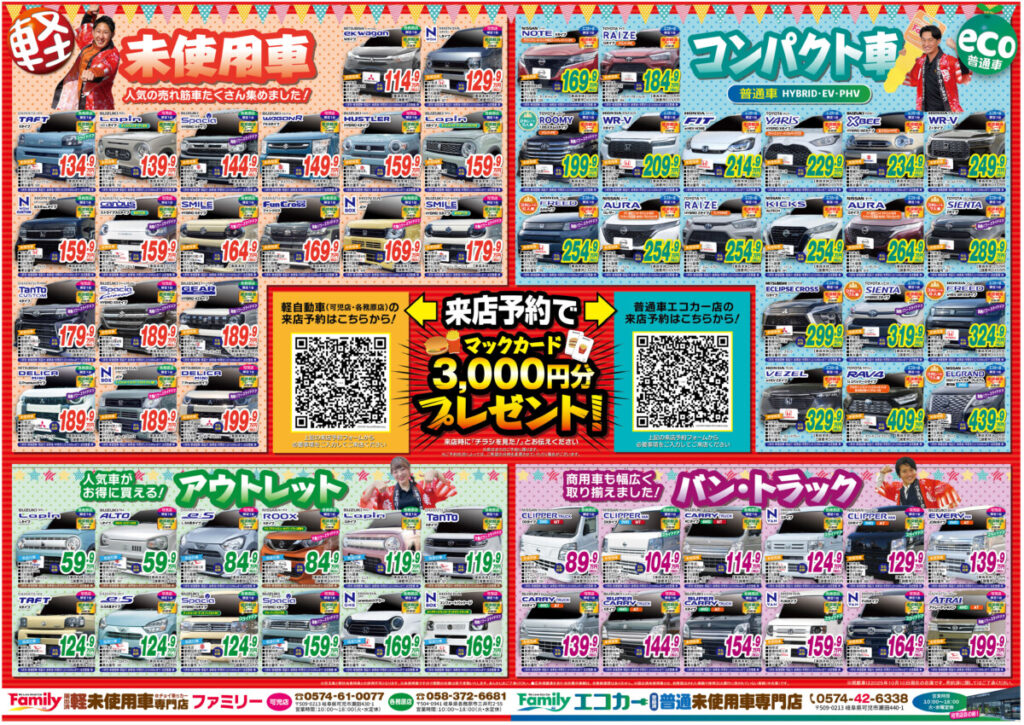 2025.10.17 イベント・キャンペーン, 車をお得に買う アウトレット, お得, コンパクト, トラック, バン, マックカード, 一宮市, 可児市, 各務原市, 土岐市, 多治見市, 大垣市, 安い, 小牧市, 岐阜, 御嵩町, 未使用車, 未使用車専門店, 来店予約, 株式会社ファミリー, 犬山市, 瑞浪市, 瑞穂市